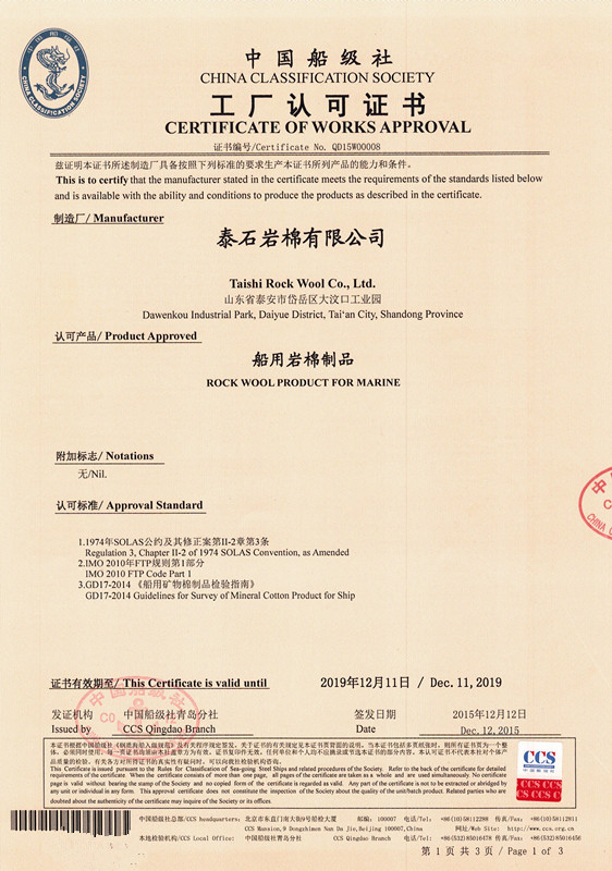 近日,泰石岩棉有限公司荣获中国船级社颁发的《中国船级社工厂认可证书》,标志着公司生产的岩棉系列产品质量已经达到准入船用岩棉行业的标准。为泰石岩棉2016年乘势而上、敢于突破,拓宽市场渠道,丰富产品结构,适应市场需求,奠定了良好的基础。