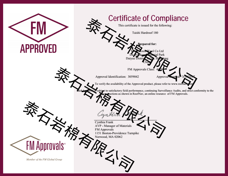 热烈祝贺泰石岩棉顺利通过FM认证。公司产品的高品质和管理水平获得行业认可,为公司开拓柔性屋面市场奠定了坚实的基础。